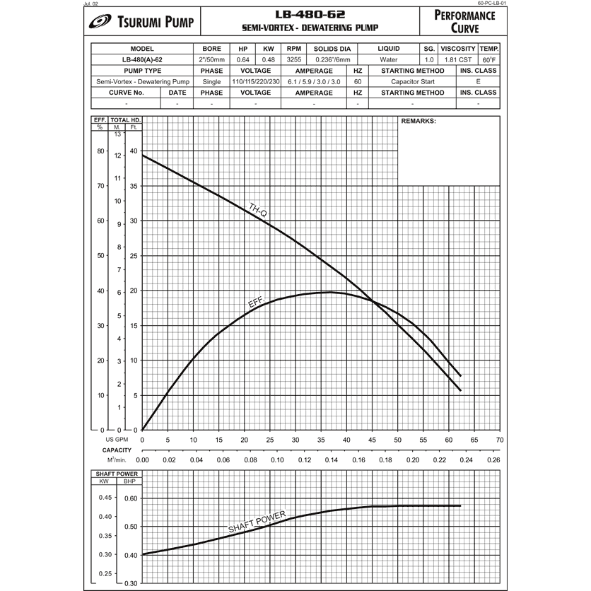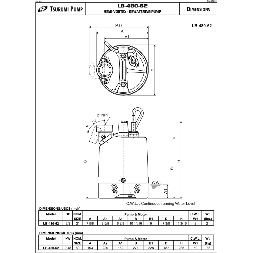 - Discharge Bore: 2 inches - HP: 23 - 1/115V (also available in 1/110V) - Weight: 26 lbs - Cable Length: 32 feet - Height: 11 inches - Diameter: 7 516 - C.W.L: 2 inches Features - Oil Lifter provides lubrication of the seal faces (Patent Pending) - Discharge can be turned both 90 and 45 degrees - Urethane Semi Vortex Impeller guarantees durability and high-quality performance - Double Inside Mechanical Seal with SIC faces ensures and extensive operational life - V-Ring Seal Protector protects mechanical seal from abrasive particles - Internal timer eliminates pump short cycling - Available with Oil Smart sensing system All Tsurumi Pumps come standard with a 2 year warranty from date of purchase